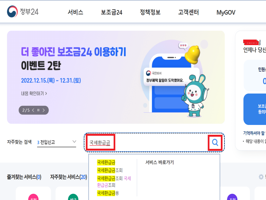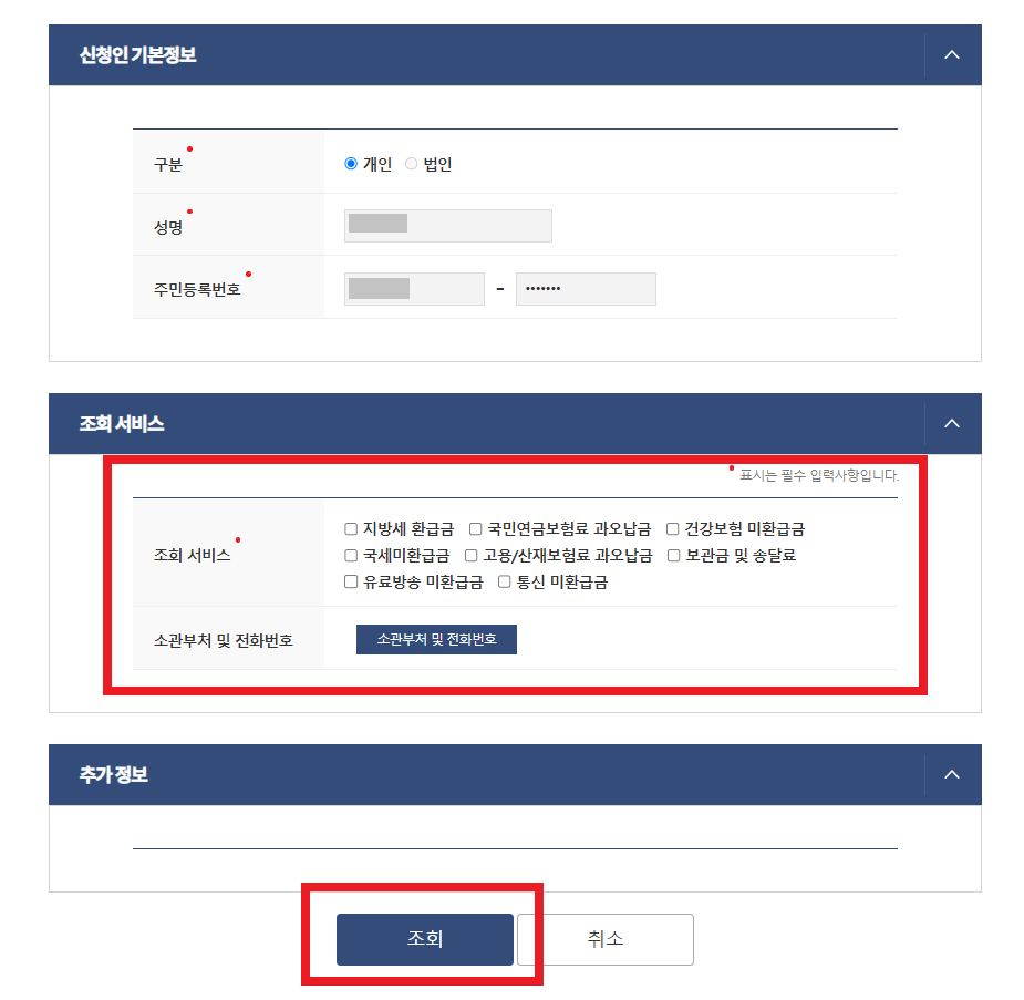 로그인한 후, 검색창에 '국세환급금'을 입력하고 조회하여 줍니다.