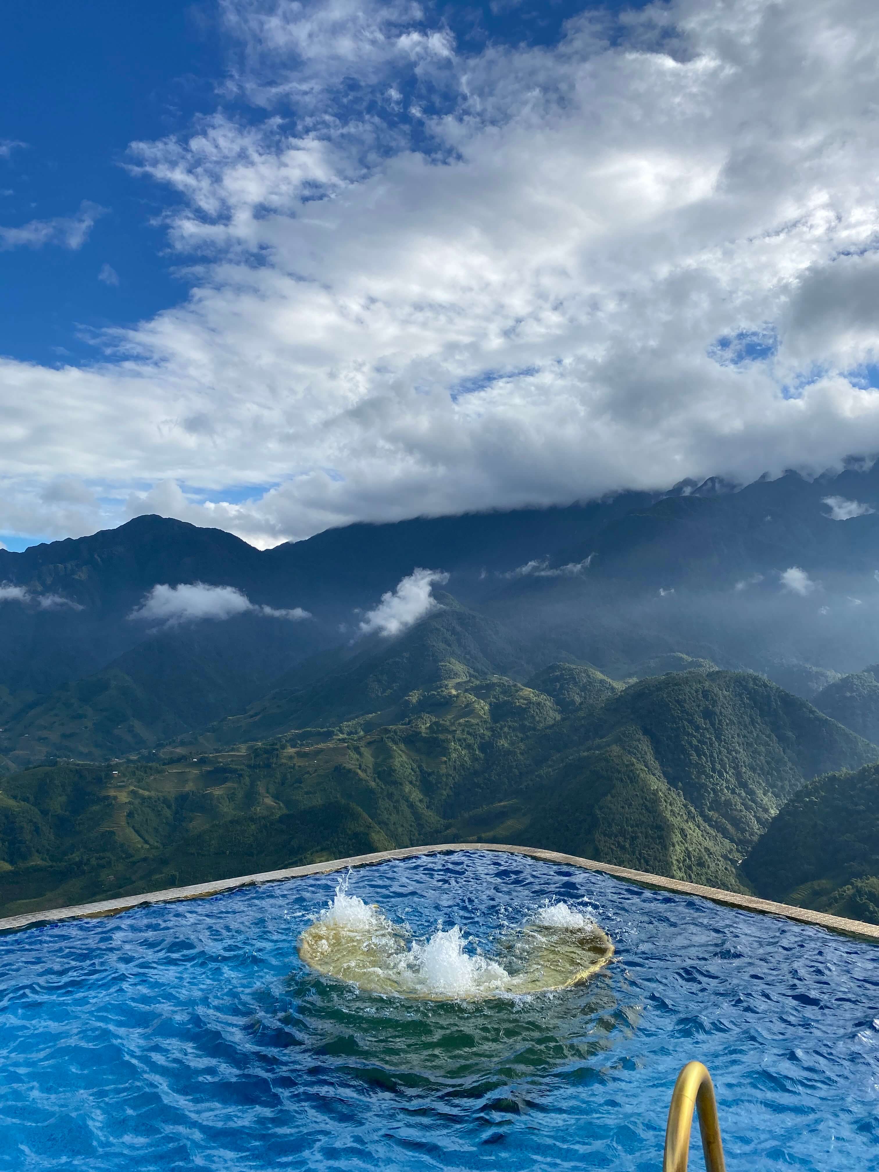 뷰가 장관입니다. 차가운 물이라서 처음에 들어갈 때 좀 오래걸렸습니다. 아직은 조금 덜 쌀쌀한 날씨지만, 사파는 하노이보다 북쪽에 위치하기 때문에 기온이 더 낮습니다. 하지만 때는 9월이라 아직 여름 날씨이기 때문에 수영복을 입고 들어갈만했습니다.