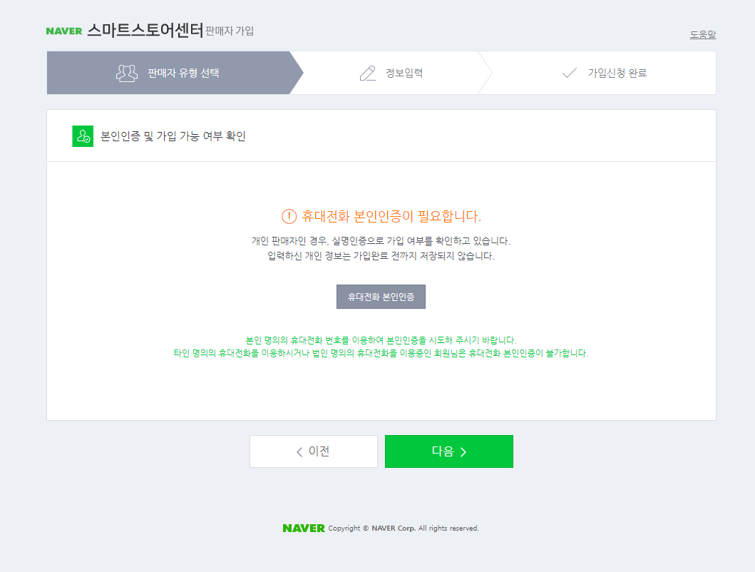 4.판매자유형을 선택하면 본인인증 및 가입가능 여부 확인을 해야합니다. 휴대전화로 본인인증하고 다음으로 넘어가시면 됩니다.