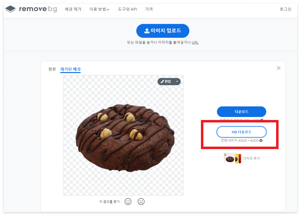 원본과 제거된 배경을 둘 다 확인할 수 있습니다. 미리보기의 이미지 500*500을 다운로드 하시면, 완성입니다.