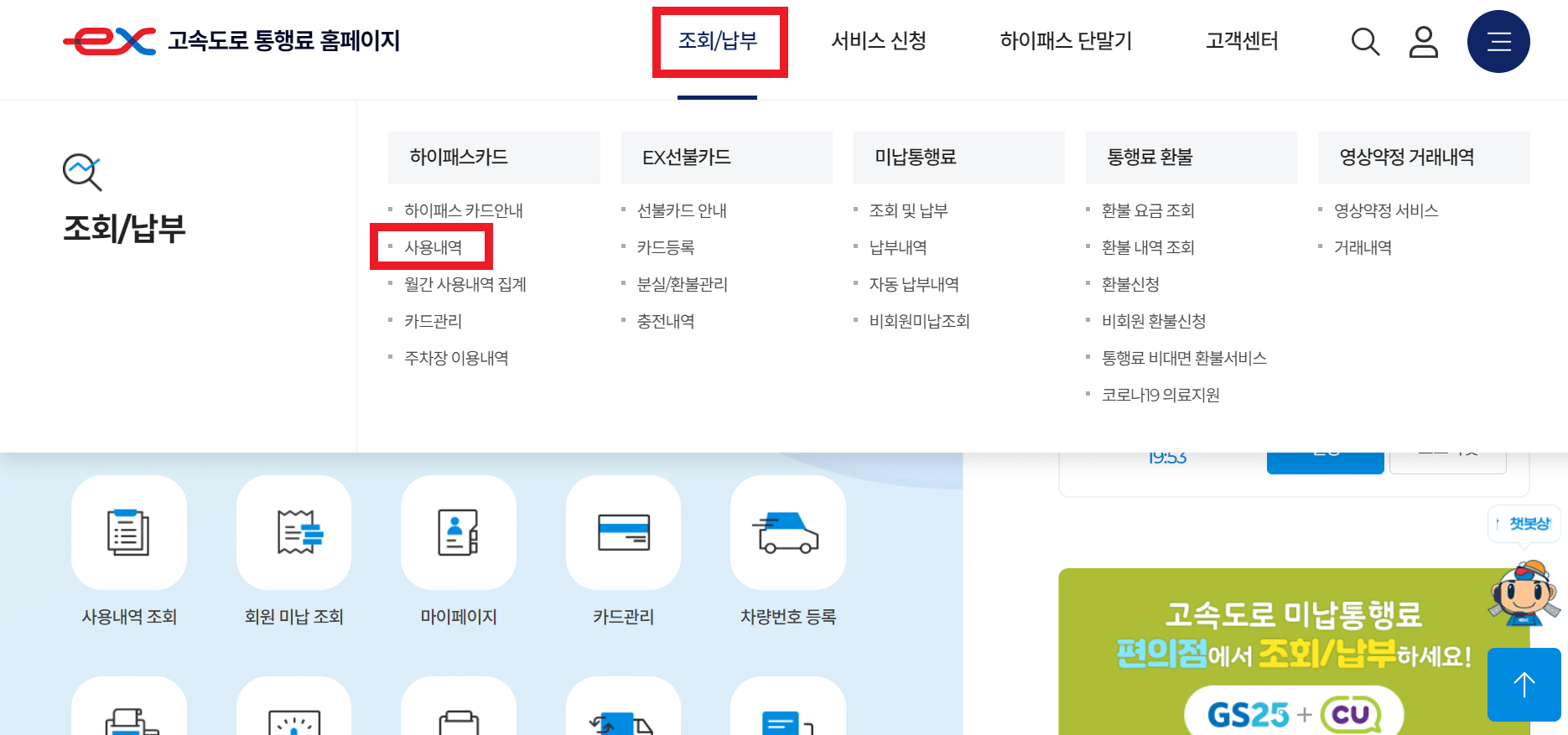 하이패스 영수증 출력 서비스는 로그인이 필요합니다. 그래서 별도의 회원가입이 필요하지만, 회원가입이 간단한 편이기에 가입해주시는 것이 좋습니다. 회원가입을 진행하고, 메인화면 상단의 조회/납부에서 사용내역을 클릭합니다.