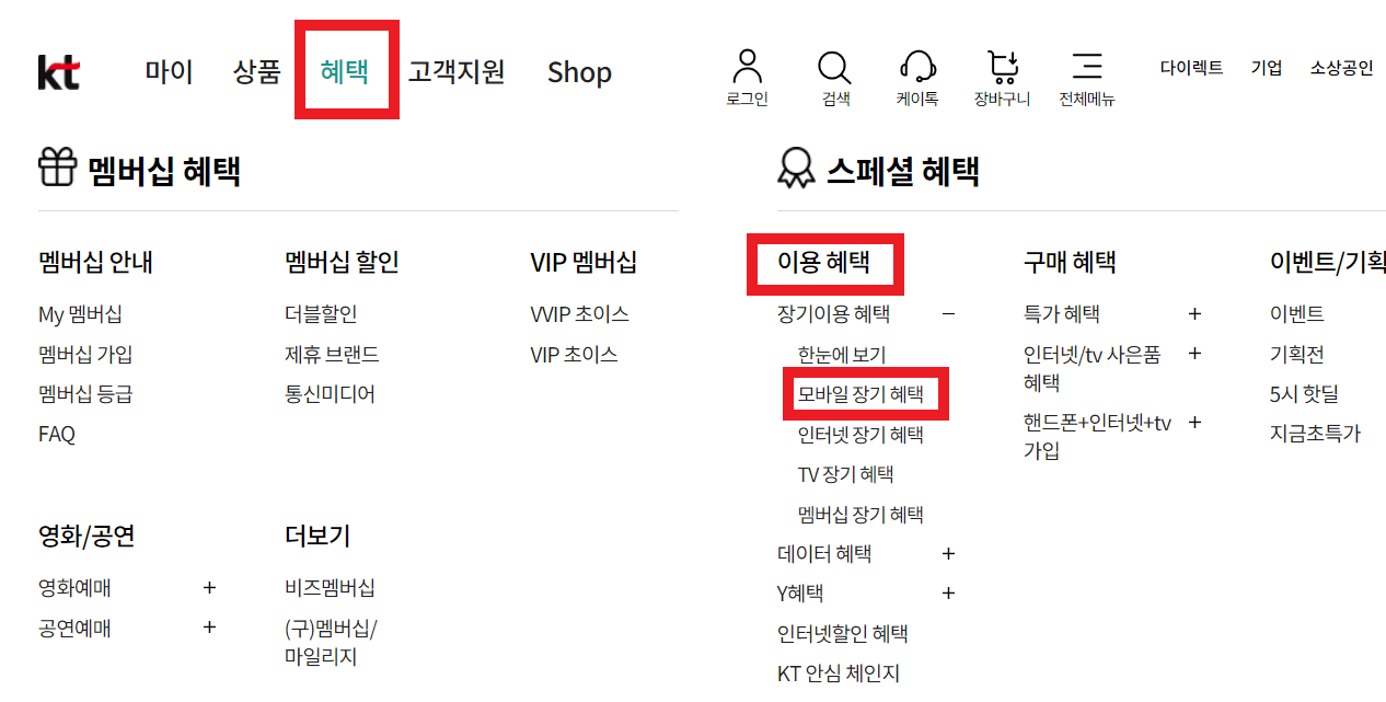 홈페이지 상단의 혜택의 이용 혜택 그리고 모바일 장기 혜택을 선택해 줍니다.
