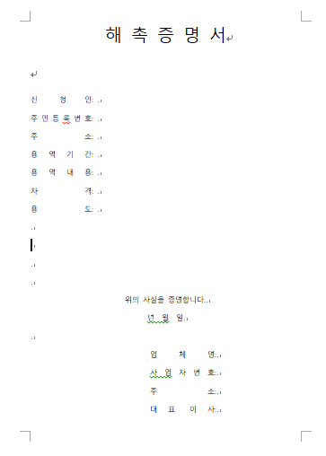 해촉증명서 양식에는 성명(신청인), 주민등록번호, 재직기간, 재직내용, 자격, 용도, 증명서 작성일자, 업체정보(업체명, 사업자등록번호, 주소, 대표이사 성명 및 직인) 등이 포함되어 있습니다. 특정한 양식을 원하는 것이 아니기 때문에 구성 내용이 포함되어 있다면, 직접 만들어서 사용하거나 유료 폼을 구입하셔도 됩니다.